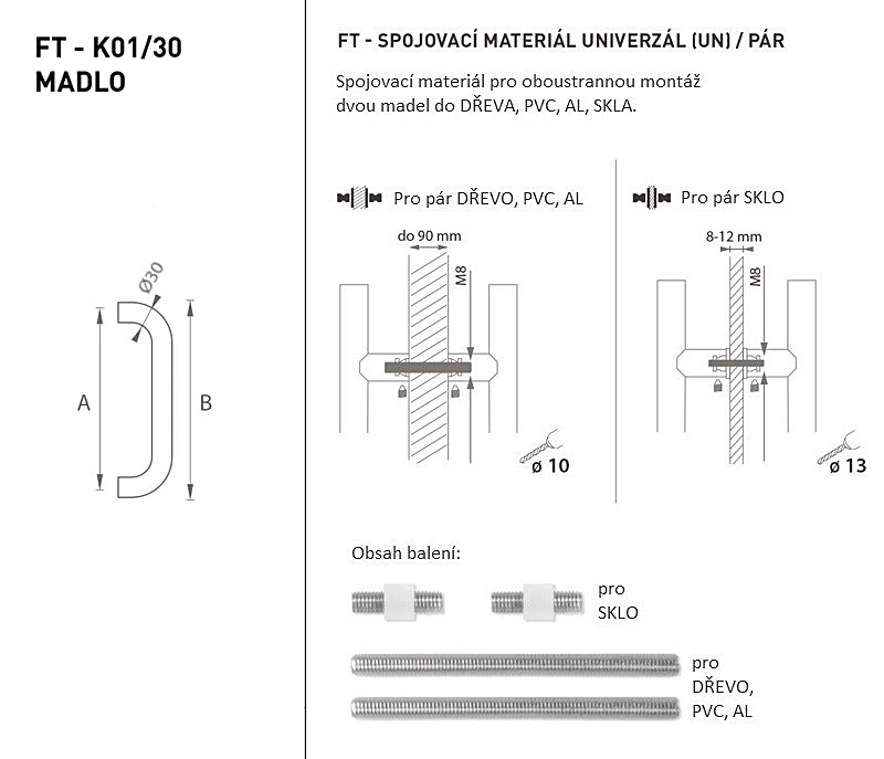 Az UNIVERSAL (UN) készlet rögzítőelemeket tartalmaz két fogantyú kétoldalas felszereléséhez fából, PVC-ből, alumíniumból és üvegből.