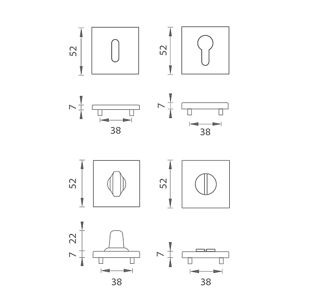 Kialakítás: ovális lyuk a belső kulcsnak (BB), lyuk a zárbetétnek (PZ), WC-készlet beépített kulccsal. A csomag 2 darab rozettát tartalmaz (pár), és a WC-rozetták készletként vannak csomagolva.