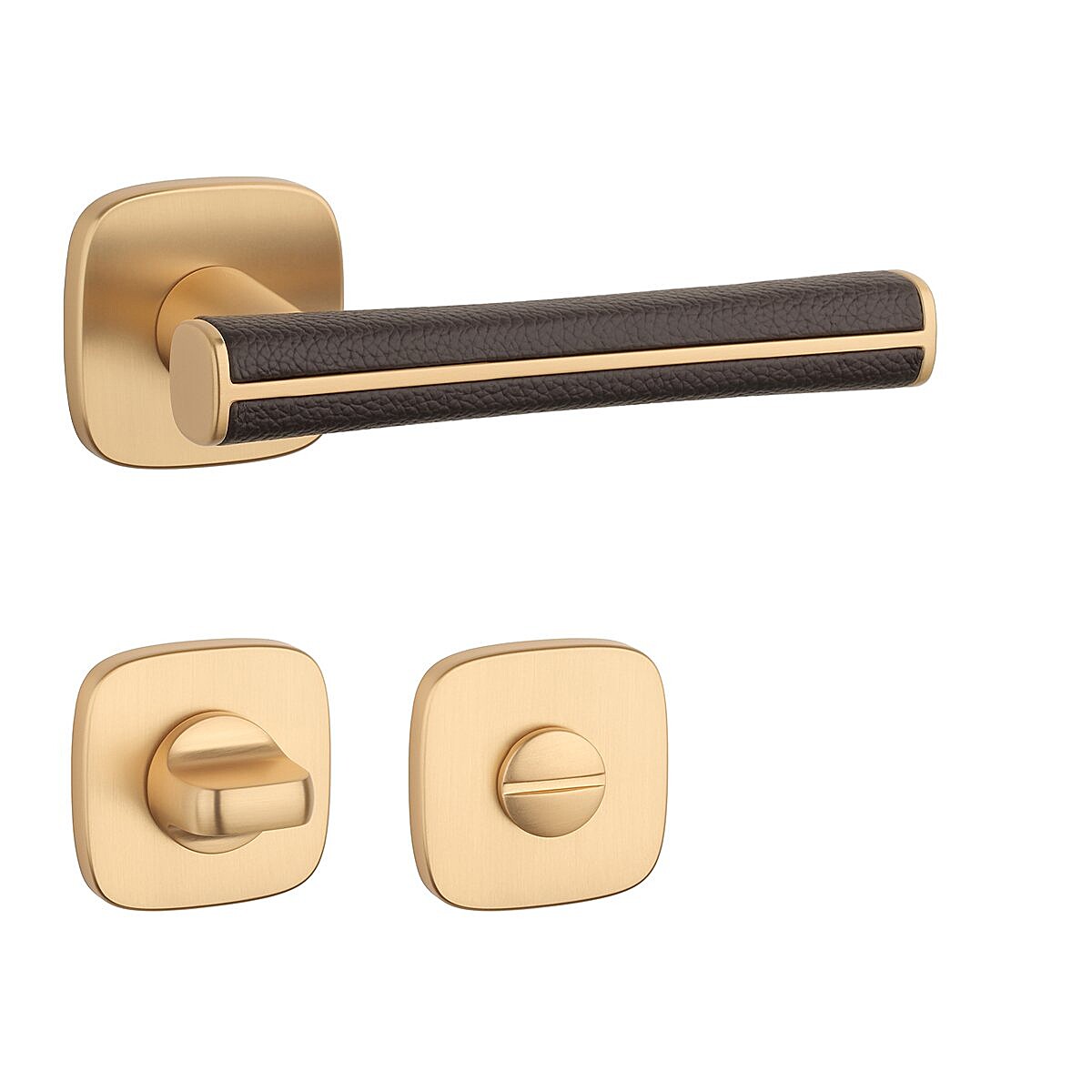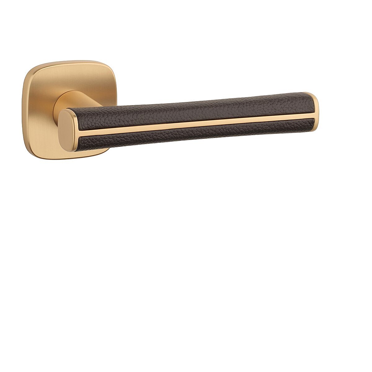A beltéri ajtókhoz való, szögletes, lekerekített rozettás kilincs kiváló minőségű anyagokból - zamakból - készült és felületkezeléssel rendelkezik. Különleges hatást kelt a kilincset körülvevő barna bőr.