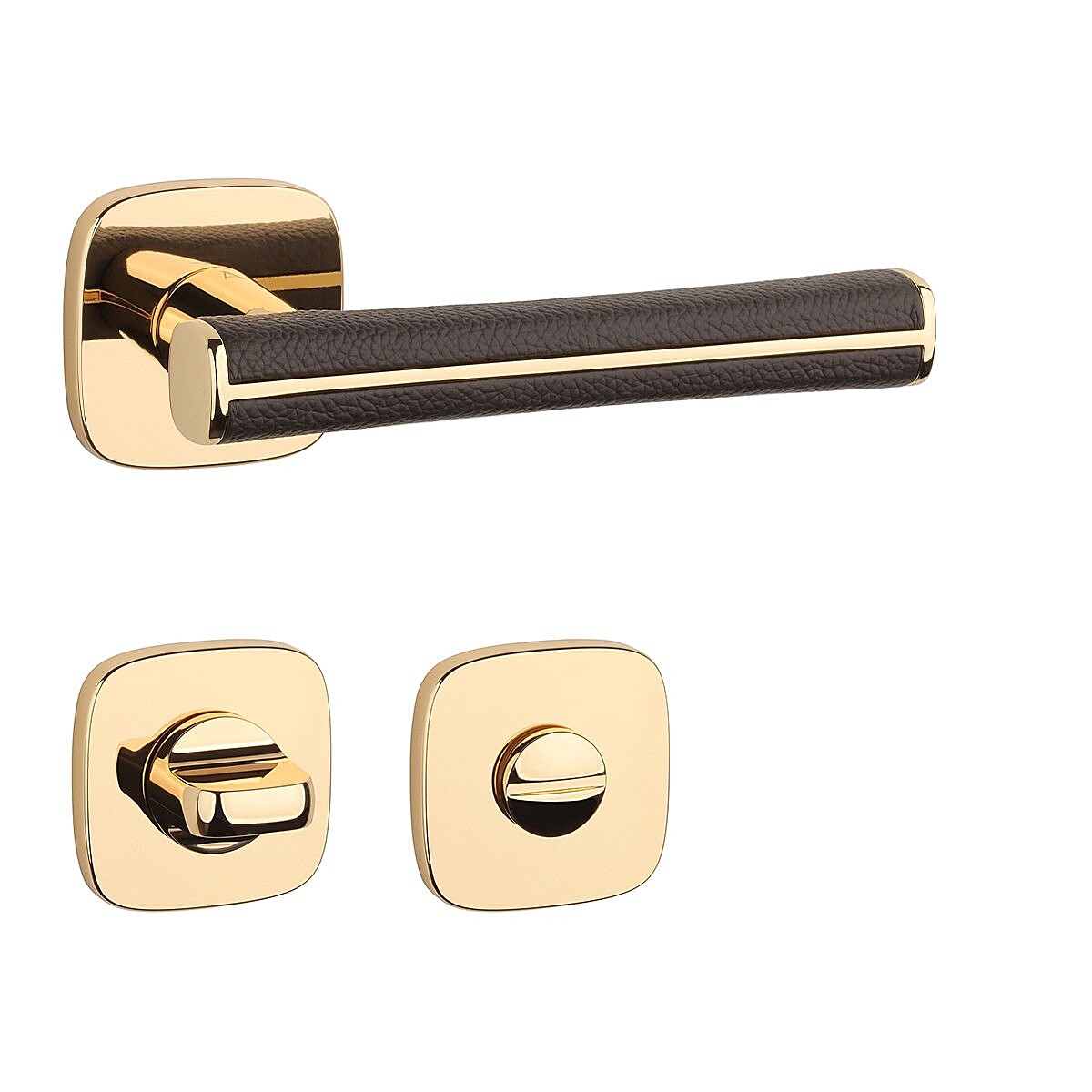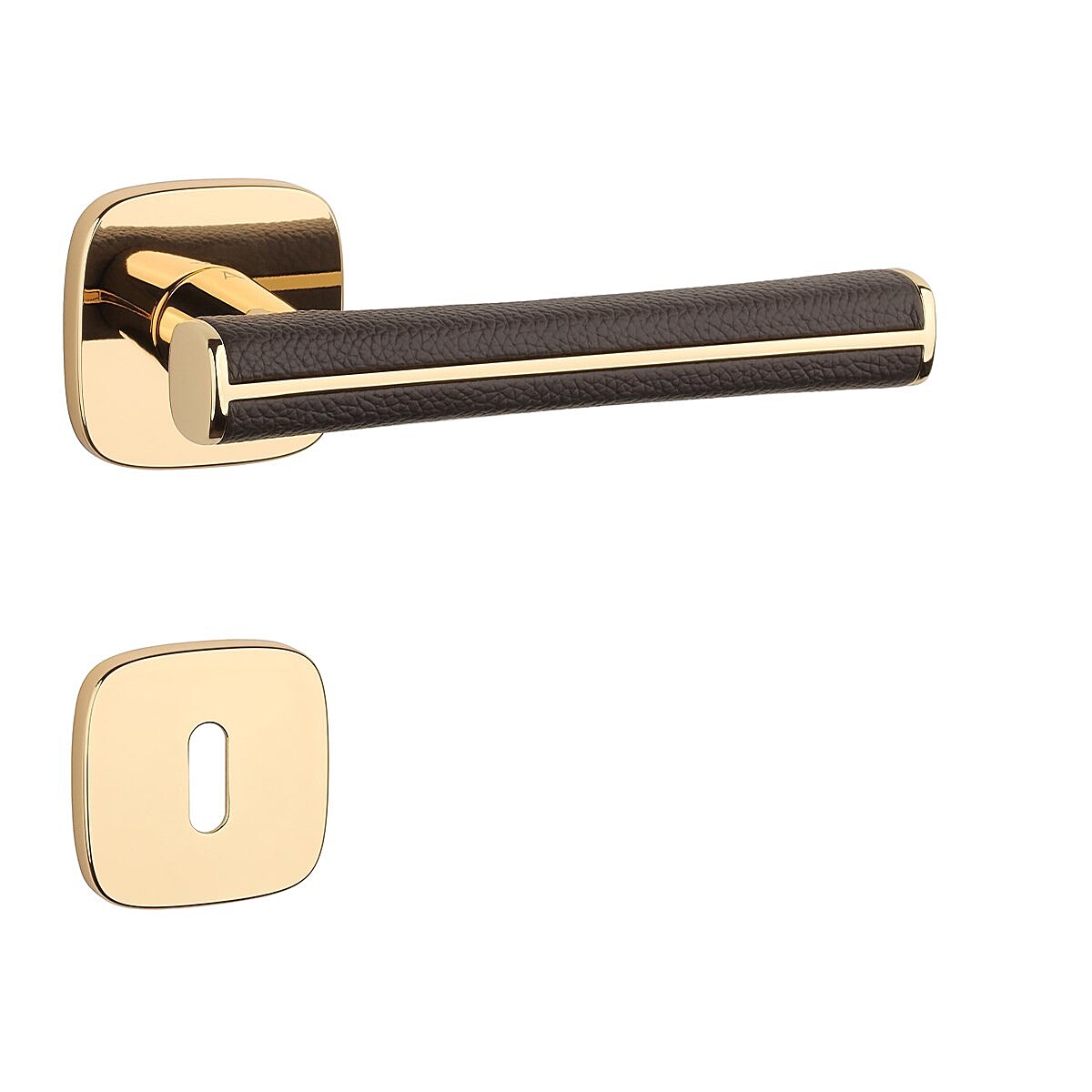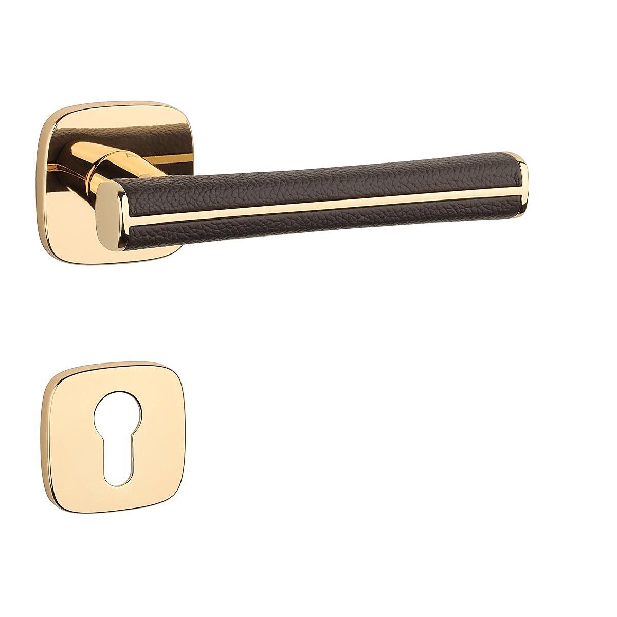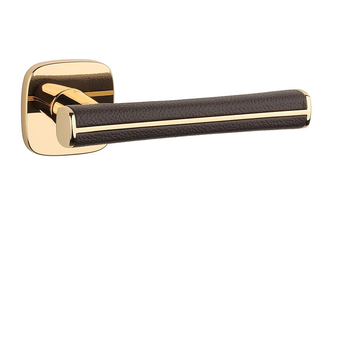 A beltéri ajtókhoz való, szögletes, lekerekített rozettás kilincs kiváló minőségű anyagokból - zamakból - készült és felületkezeléssel rendelkezik. Különleges hatást kelt a kilincset körülvevő barna bőr.