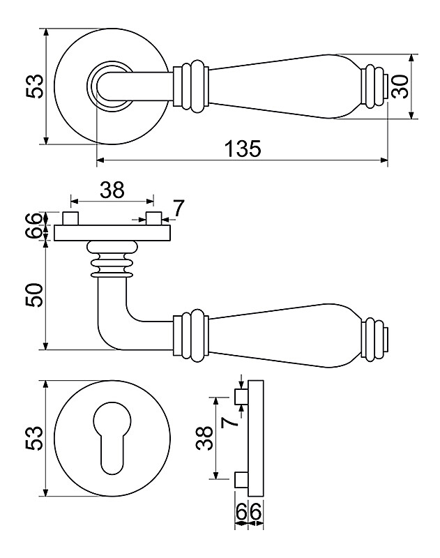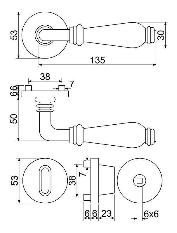 Zamak szerelvények négyzetes, kerek és téglalap alakú rozettákon, fogantyú visszahúzó rugóval