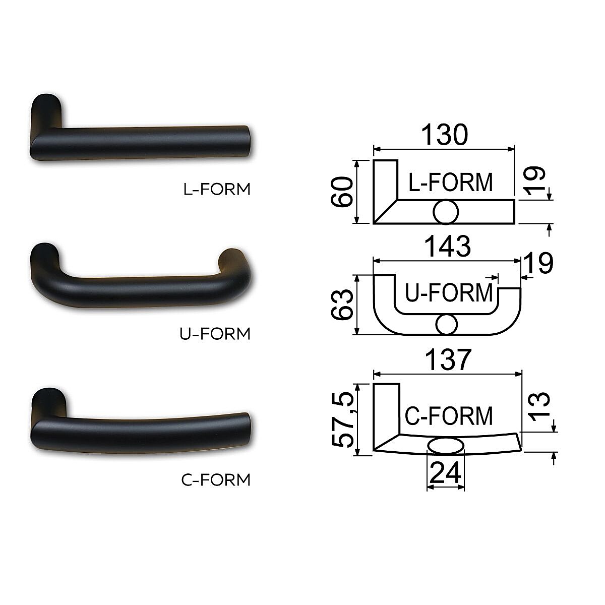 - A fogantyú alapkivitelben "C" alakú, de igény esetén "L" vagy "U" alakú kivitelben is szállítható.