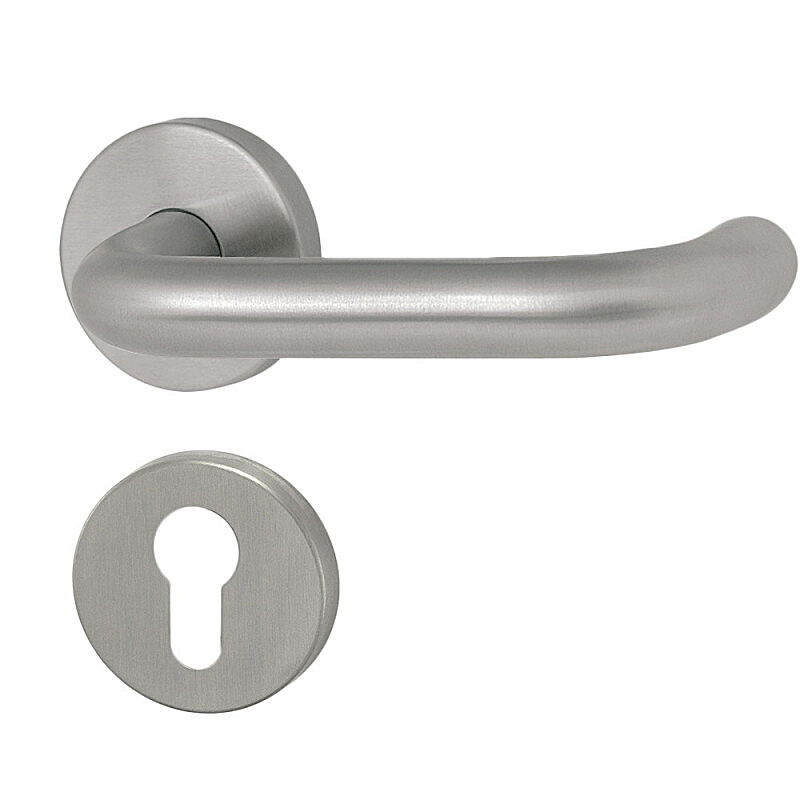 Az MT 02 kilincs kerek vagy szögletes rozettával beltérre és kültérre is alkalmas, DIN 1.4301 rozsdamentes acélból készült, szatén matt felülettel, modern és időtálló dizájnnal, higiénikusan biztonságos és tartós.