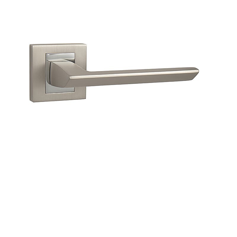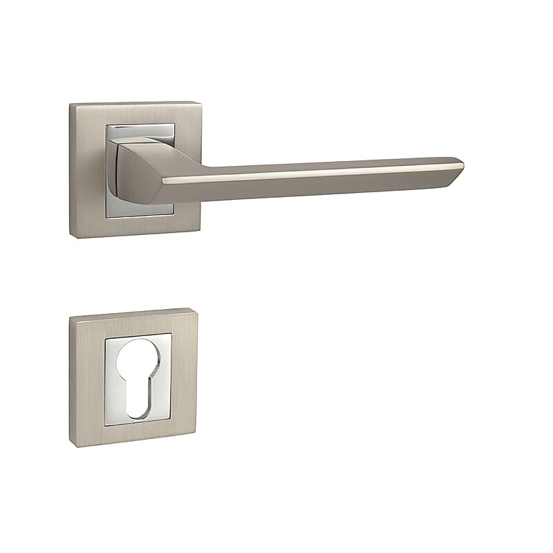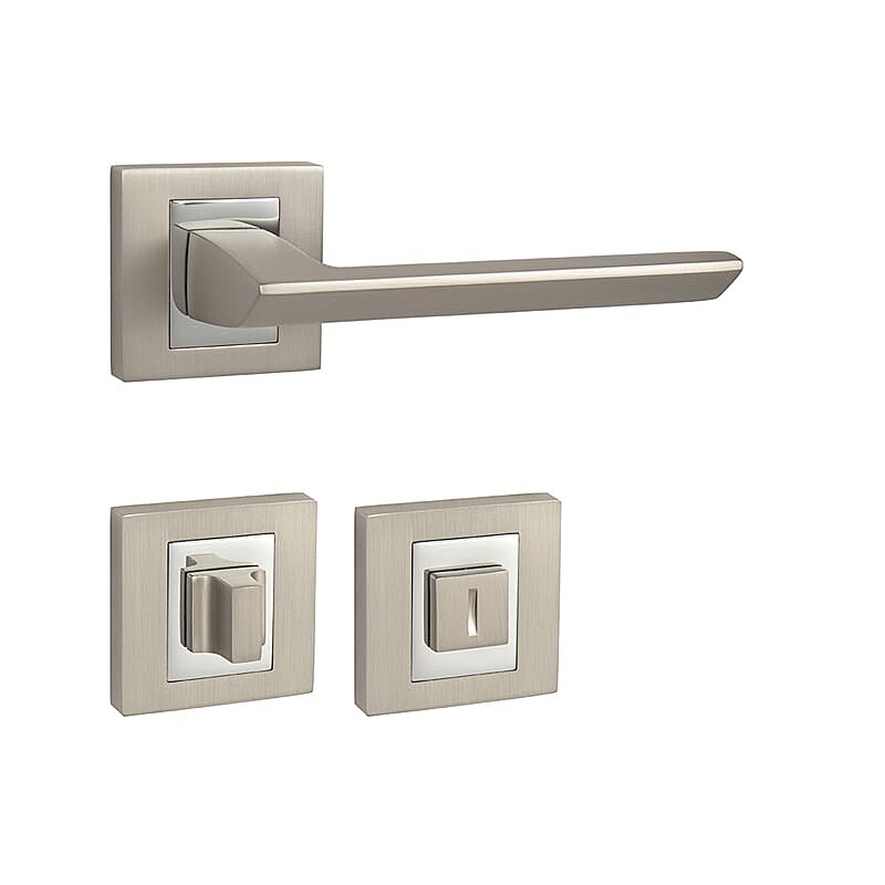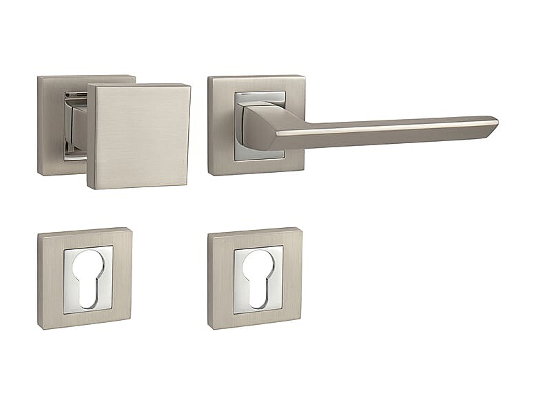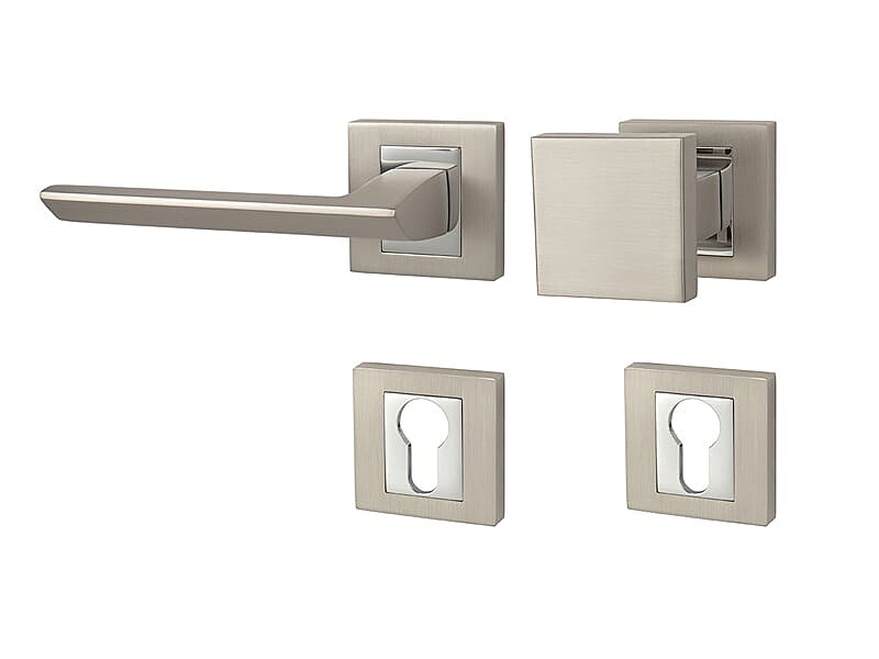 A beltéri ajtó négyzet alakú rozetta rozettás fogantyúja kiváló minőségű cink és alumínium ötvözetből öntéssel készül, felületkezelt. A rozetta mérete 52 mm x 52 mm, vastagsága 10 mm. A fogantyú felületkezelt galvanizálással rendelkezik, és nagy korrózióállósággal rendelkezik. A szerelvényeket 100 000 ciklusra tesztelték.