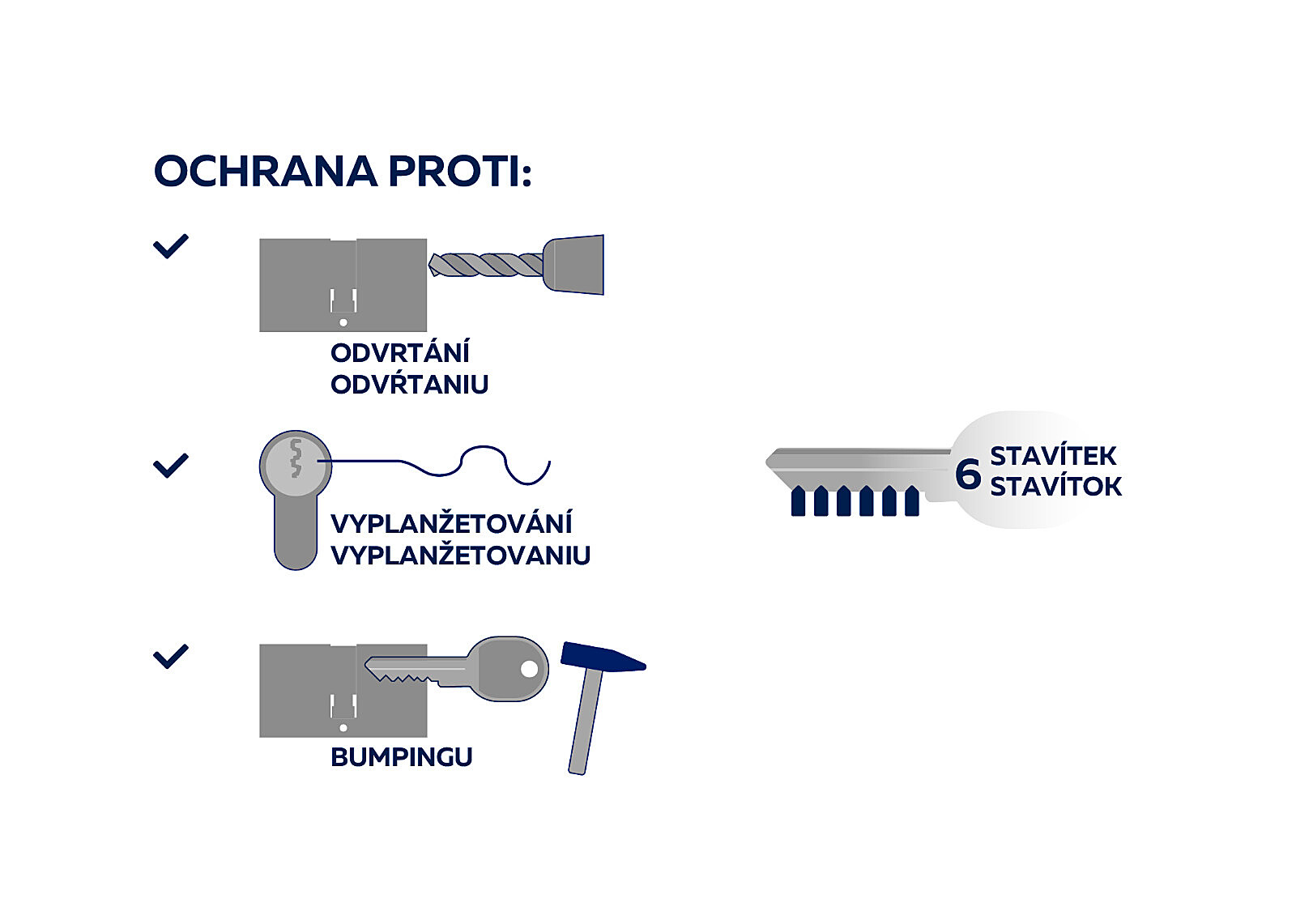 - Fúrásvédelem 6 edzett acél elemmel. 5 csapból és 1 forgócsapból áll.