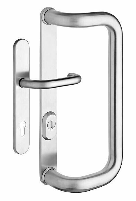 A belső védőlemezzel és fogantyúval ellátott rozsdamentes acél vasalatok jobbos és balos bejárati profilajtókhoz egyaránt alkalmasak.