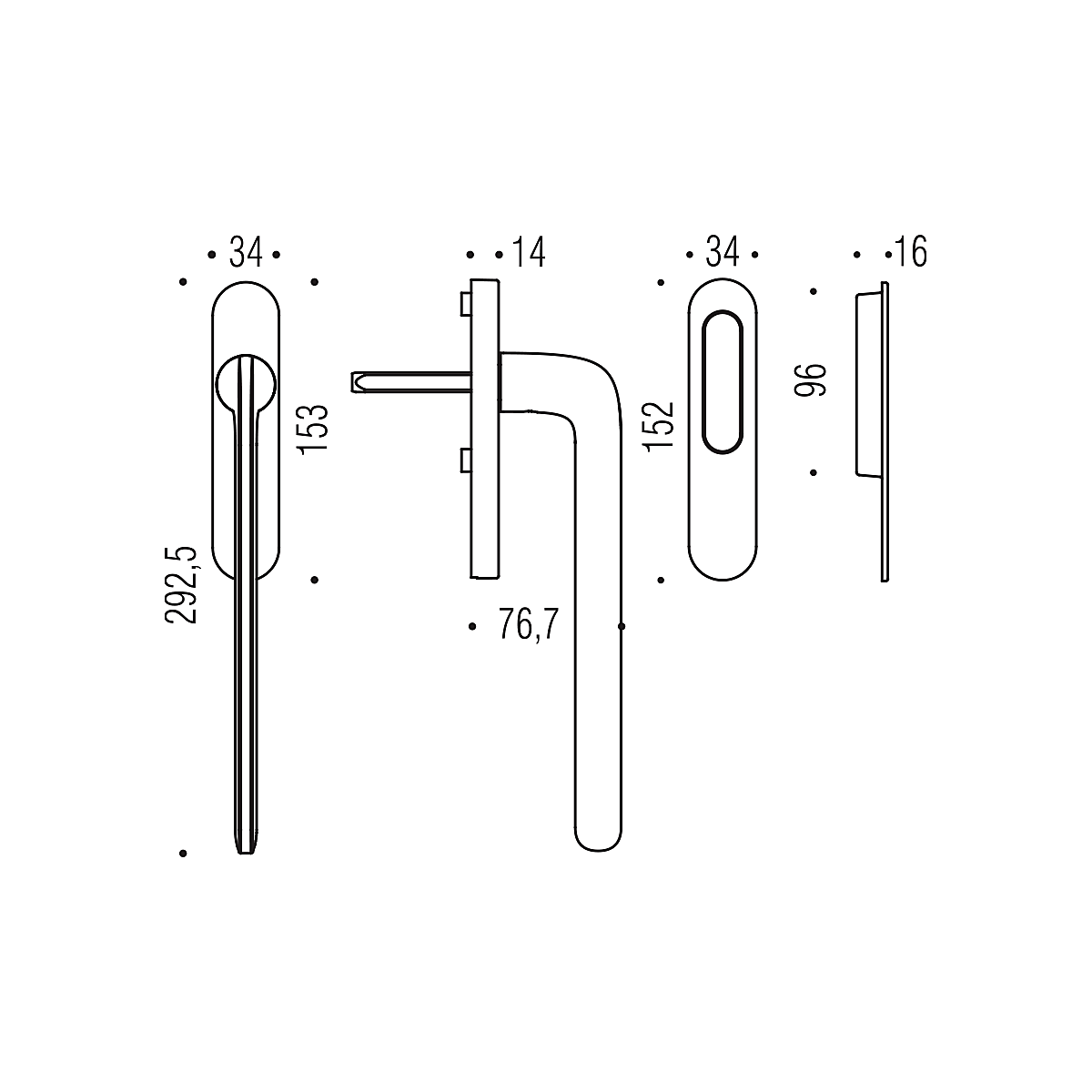 Az ovális rozetta méretei 34 mm x 153 mm, vastagsága 14 mm.